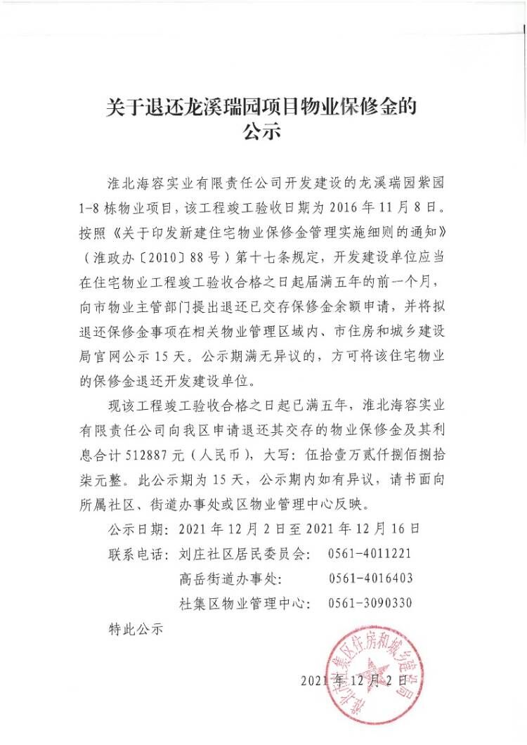 关于退还龙溪瑞园项目物业保修金的公示