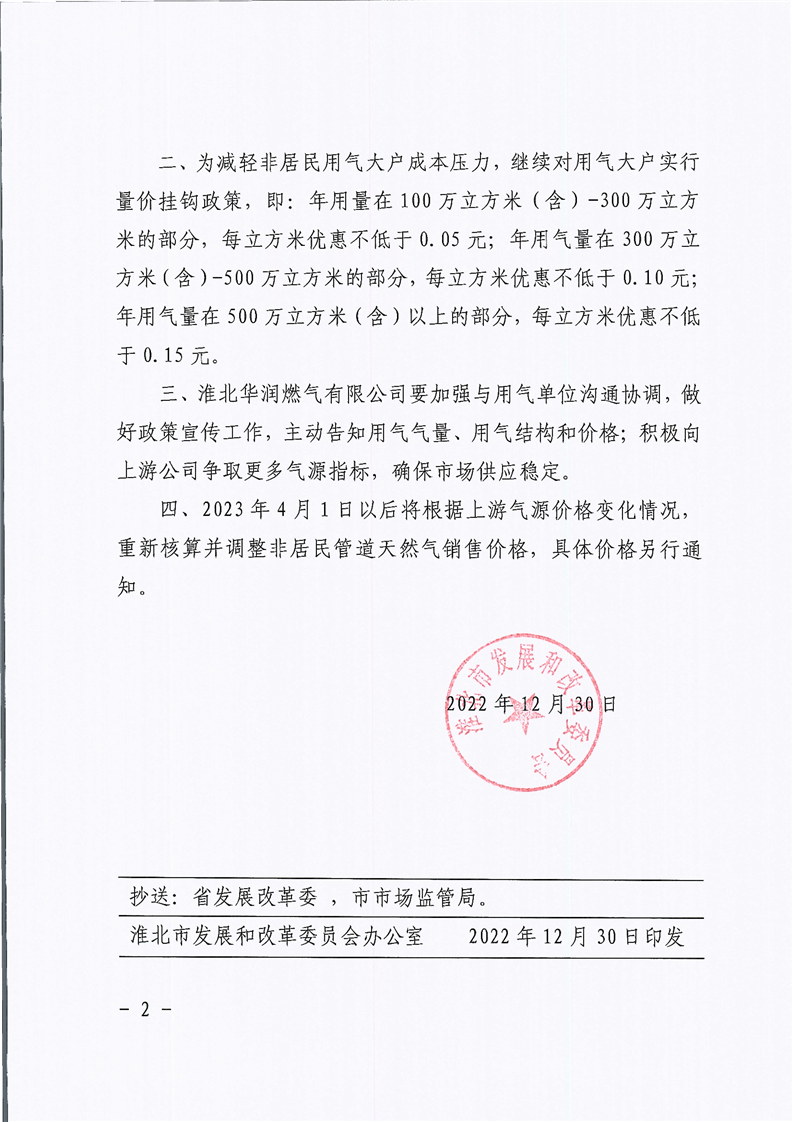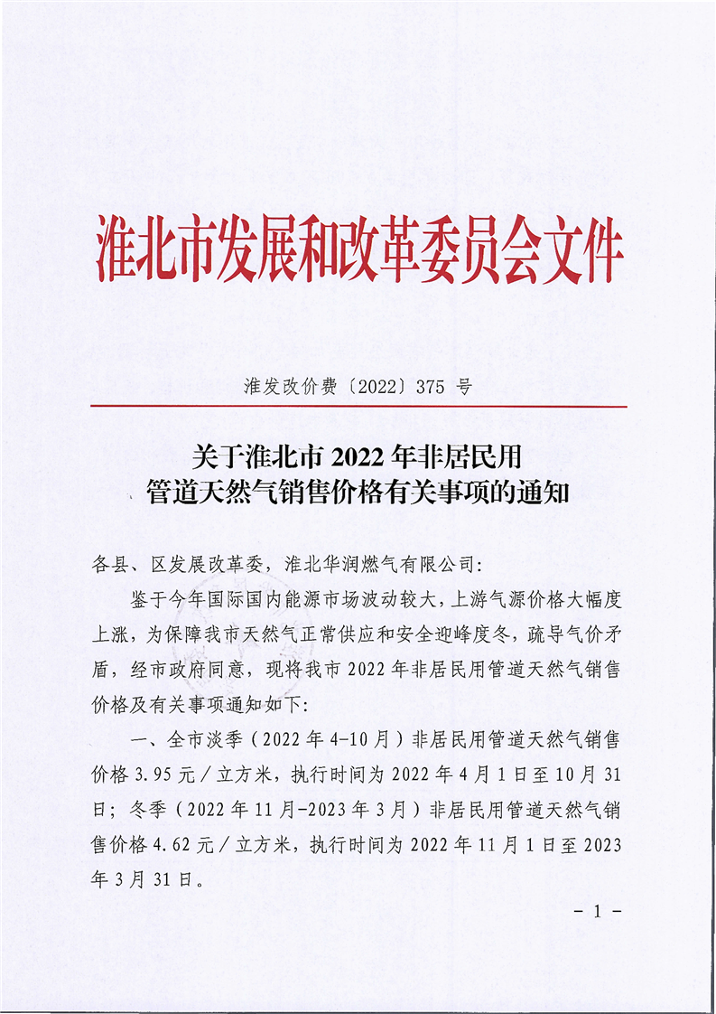 关于淮北市 2022 年非居民用管道天然气销售价格有关事项的通知