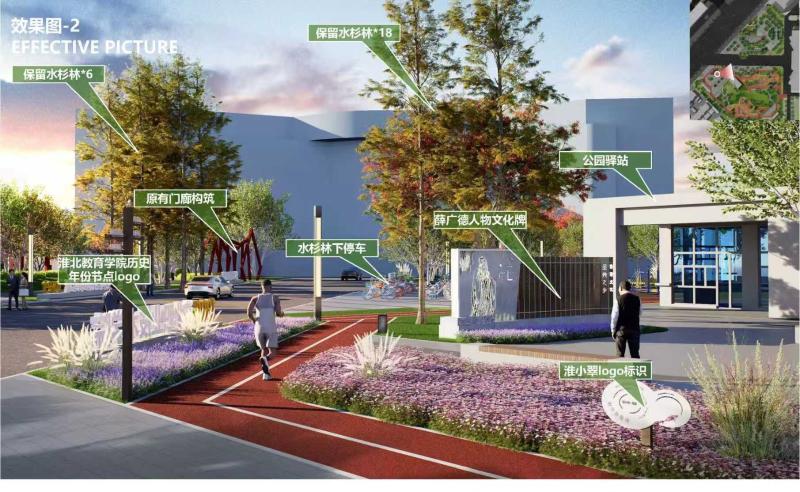 建设遵循“动静分离、功能互补”原则,北侧保留现有党建构筑,通过改造广场、增设坐凳等,强化其作为党建示范街区的形象与休憩功能;南侧建设彩色步道、诗经文化廊架雕塑、健身区、儿童及少年活动区等,并营造疏朗通透的绿色景观。同时,通过在园内设置淮北教育学院历史年份节点等文化标识,将地域文化融入景观,实现功能、生态与文化的有机统一。