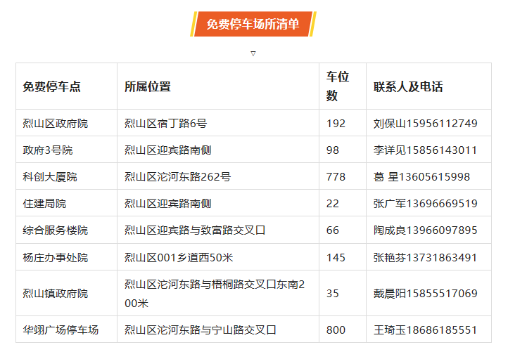 烈山区政府院、政府3号院、科创大厦院、区住建局院、综合服务楼院、杨庄办事处院、烈山镇镇政府、华翊广场等8个政府企事业单位停车场。