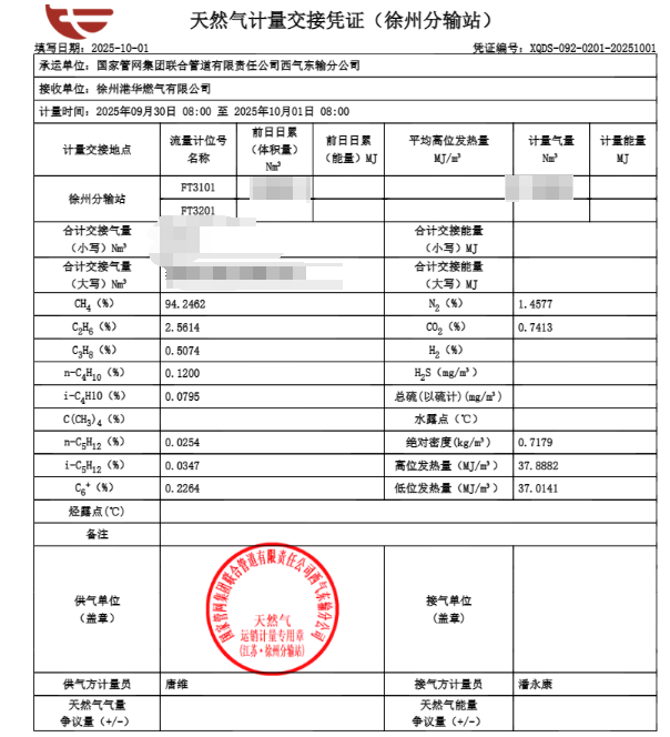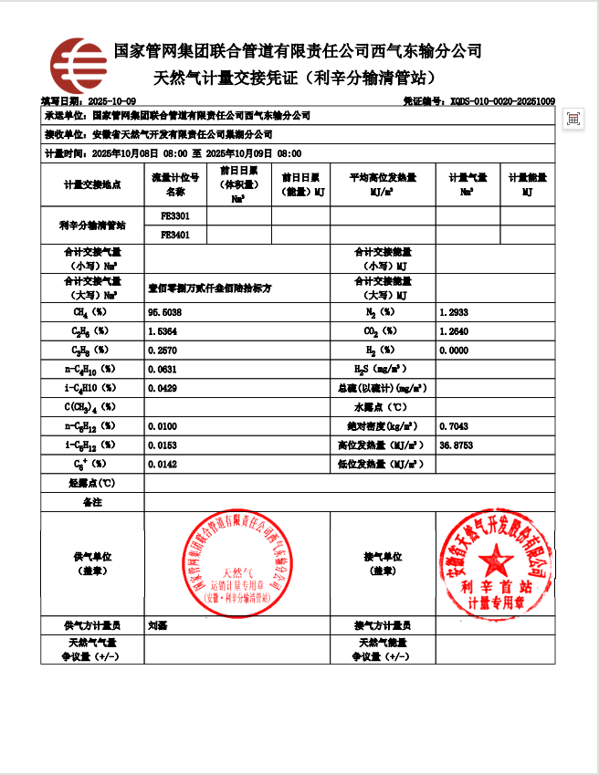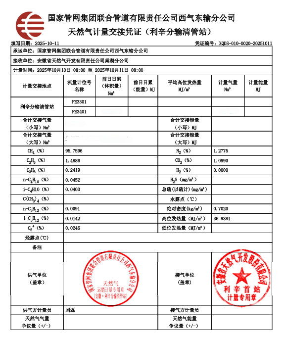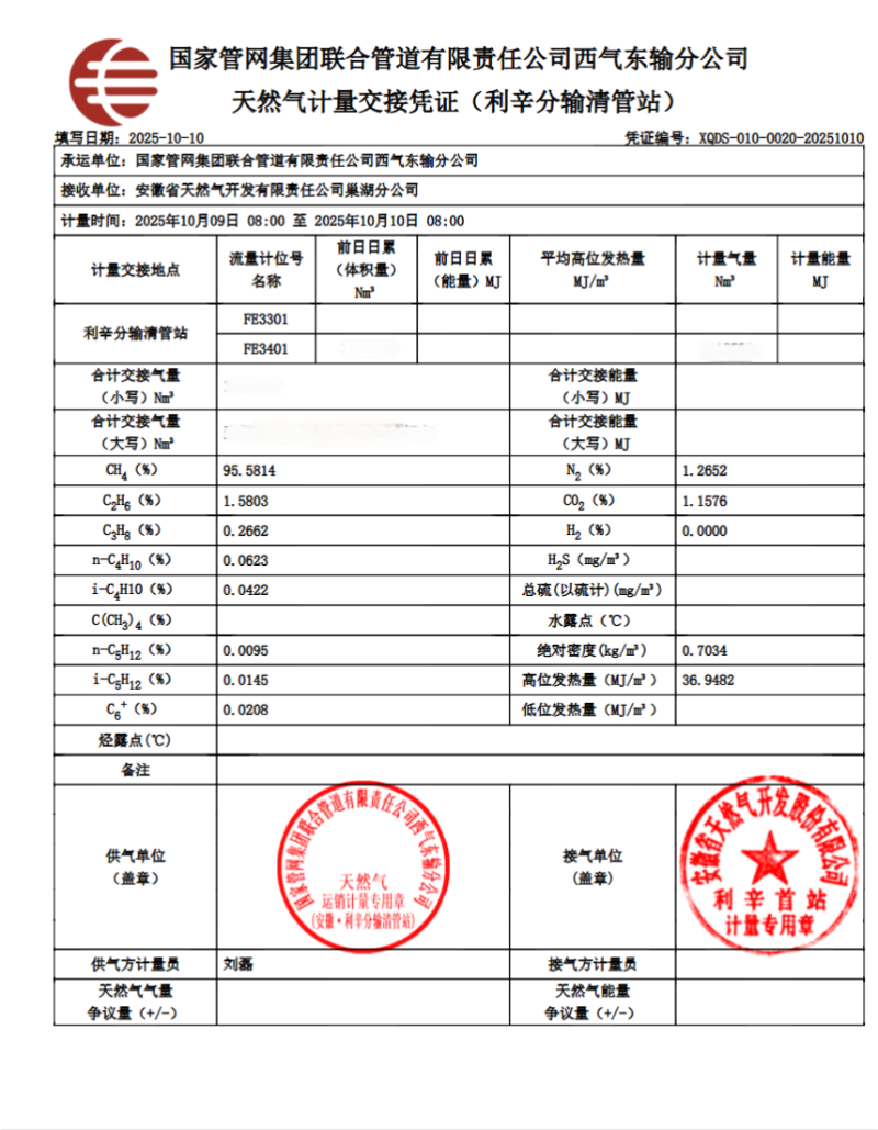 淮北华润燃气有限公司2025年10月份气质检测报告