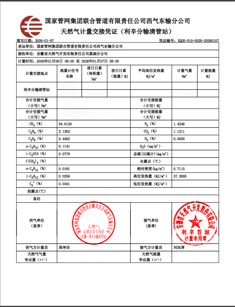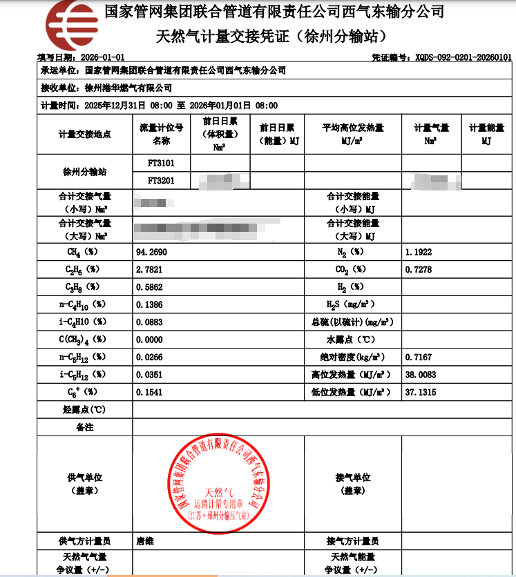 淮北华润燃气有限公司2026年1月份气质检测报告