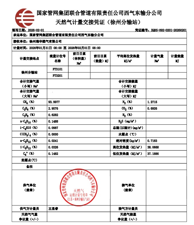 淮北华润燃气有限公司2026年2月份气质检测报告