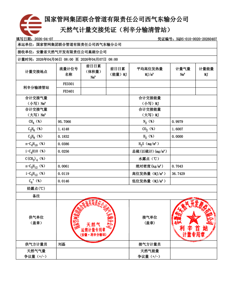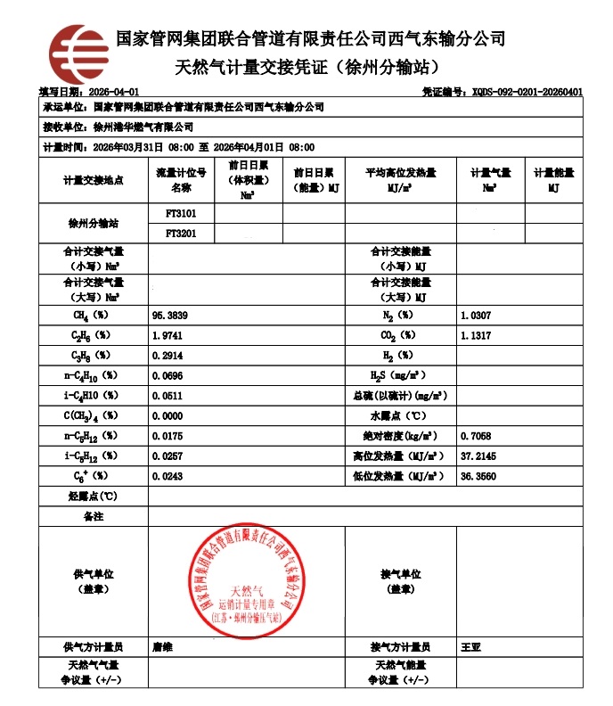 淮北华润燃气有限公司2026年4月份气质检测报告