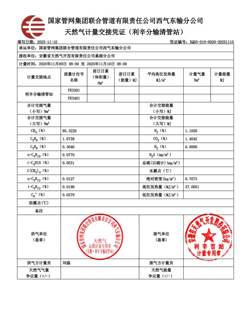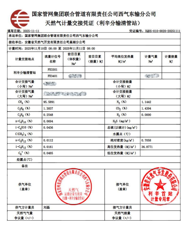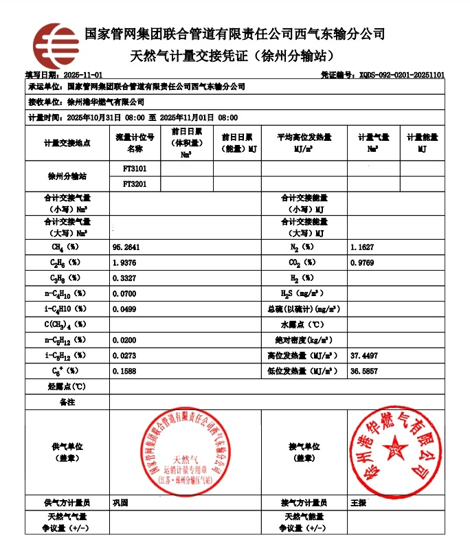 淮北华润燃气有限公司2025年11月份气质检测报告